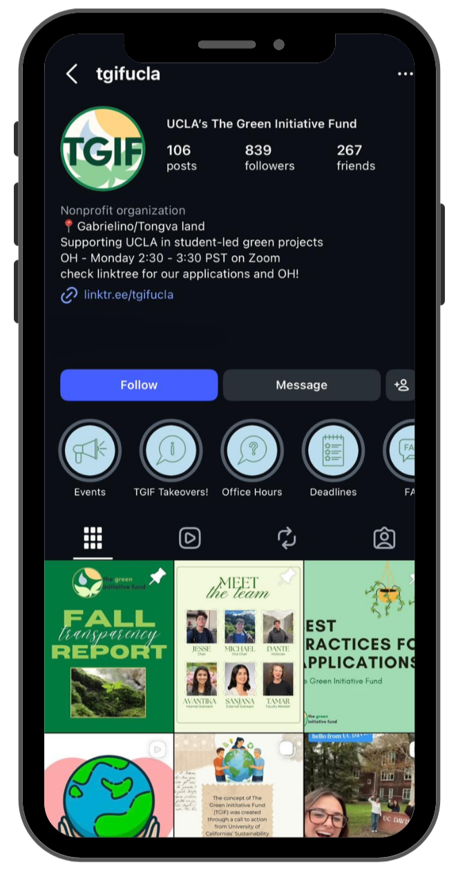 The Green Initiative Fund (TGIF) is UCLA’s Green Fund. The goal of TGIF is to enable and empower students to take an active role in making UCLA a leader in sustainability. TGIF supports and provides much needed funding for projects that promote the mission of UCLA sustainability, which is to create a culture in which the entire UCLA community is aware of, engaged in, and committed to advancing sustainability.